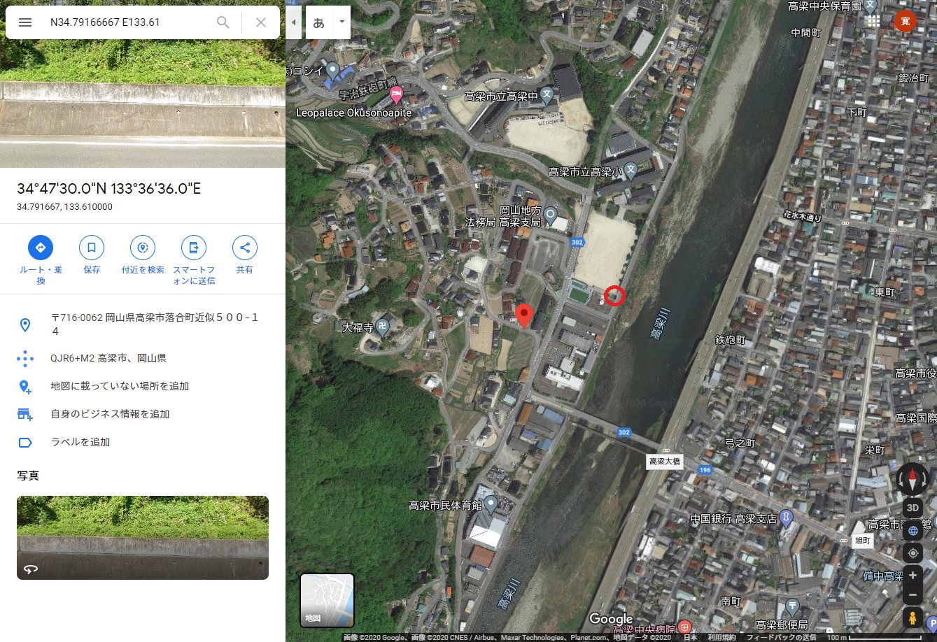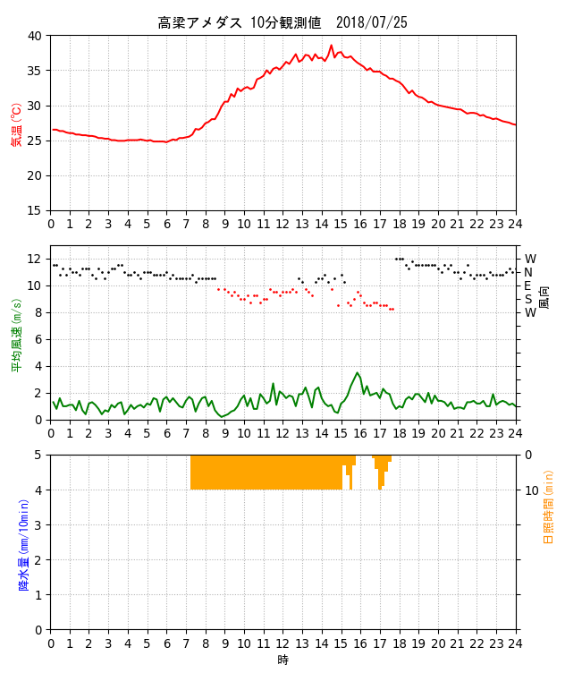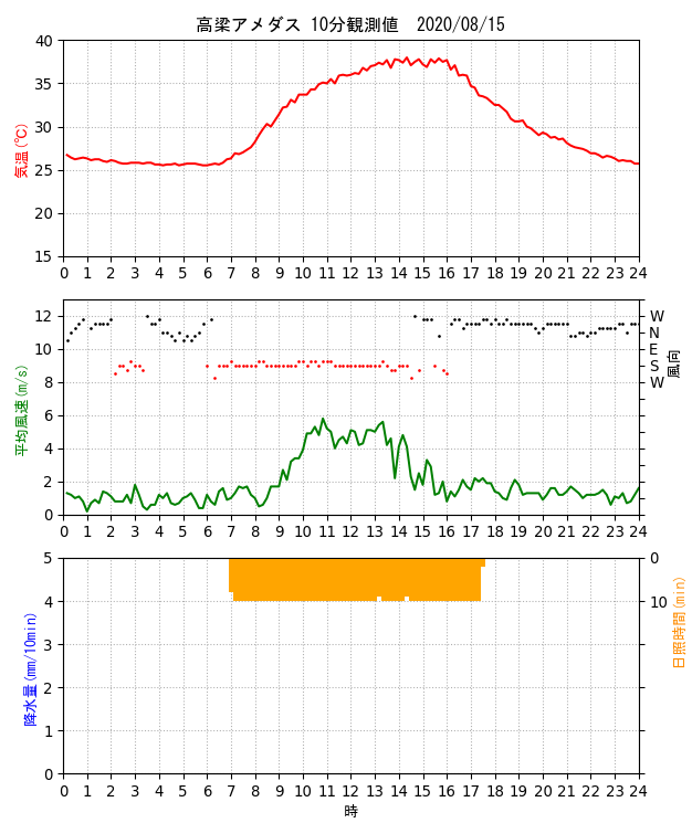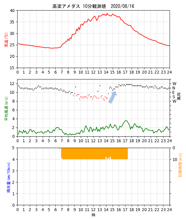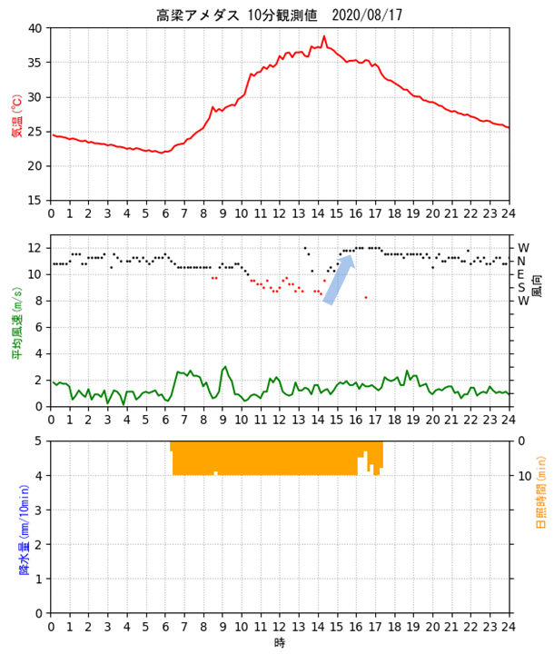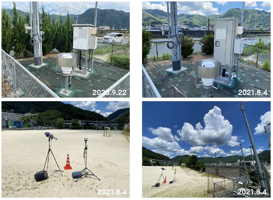 高梁アメダス(岡山県)の高温について1.高梁アメダスの場所 高梁アメダスは岡山県中西部の高梁市にある。 気象庁HPによるとその位置は、北緯34度47.5分、東経133度36.6分、標高60mとなっている。 その緯度・経度は赤マークの地点を示すが、実際は高梁川沿いの赤〇の場所にある。 ![]() ストリートビューで見た高梁アメダス。右が高梁川で奥から手前に流れている。 ![]() 2.高梁アメダスの日最高気温記録 高梁アメダスでは今年(2020年)8月21日に日最高気温の記録を更新した。 また、トップ10のうち、3位、4位、10位も今年記録したものである。 (2020.9.21追記) 10位は38.3℃を記録した2020年8月30日に変わった。それまで10位だった2020年8月15日も38.3℃で同値である。 また、高梁は国内の猛暑日連続日数で、それまでの大分県日田市の22日を超え、記録を更新した。 下記記事の翌日(9月1日)も猛暑日となり、猛暑日の連続日数は24日(2020年8月9日〜9月1日)となった。 https://tenki.jp/forecaster/deskpart/2020/08/31/9580.html https://kishojin.weathermap.jp/diary_detail.php?date=2020-08-31 3.2020年8月21日の気象データ 高梁アメダスの2020年8月21日の気象データは下図の通り。 最高気温は14時35分に、39.3℃を記録している。 前後の時刻の気温、風速・風向は 14:20 37.9℃ 南西 1.1m/s 14:30 39.0℃ 南東 1.9m/s 14:35 39.3℃ ※最高気温 14:40 37.5℃ 南東 1.1m/s 14:50 37.0℃ 北東 1.0m/s 風向が南西(14:20)から南東(14:30)に変化した途端に1.1℃気温が上昇、その後最高気温を記録(14:35)し、北東(14:50)に変化すると下降している。 ![]() 改めてストリートビューを見ると、アメダスの東側と南側に樹木が茂っているように見える。 現在もこのような状況かどうか現地を見ていないので不明ではあるが、これが高温に影響していないだろうか? ![]() (2020.9.22追記) 2020年9月22日に高梁アメダスの現地を確認してきた。 樹木は道路沿いにアメダスの東側に茂っている。ストリートビューではアメダスの東側から南側にL字型に樹木があるように見えたが、画像のアングルの違いによる誤認かもしれない。 ![]() 気温を測定する通風筒の南東側に樹木が茂っている。 ![]() 4.トップ10の他の日の気象データ では、他の日の気象データはどうか。 2020年8月17日は、14時18分に38.9℃を記録しているが、この日も風向が南西(14:10)から南東(14:20)に変化すると気温が1.7℃上昇、その途中で最高気温になっている。 前後の時刻の気温、風速・風向は 14:10 37.1℃ 南西 1.0m/s 14:18 38.9℃ ※最高気温 14:20 38.8℃ 南東 1.2m/s 14:30 37.1℃ 東北東 1.3m/s ![]() 2020年8月16日は、14時13分に38.9℃を記録しているが、最高気温のピークは10分観測値でみる限り前2例ほど明瞭ではない。 前後の時刻の気温、風速・風向は 14:00 37.7℃ 南南西 2.3m/s 14:10 38.7℃ 南南西 2.2m/s 14:13 38.9℃ ※最高気温 14:20 38.1℃ 東南東 1.8m/s 14:30 37.8℃ 北 2.1m/s ![]() 2020年8月15日は、15時25分に38.3℃を記録している。 前後の時刻の気温、風速・風向は 15:20 37.8℃ 西北西 2.9m/s 15:25 38.3℃ ※最高気温 15:30 37.4℃ 南 1.2m/s ![]() 次に2年前の2018年の例を見る。7月24日は、14時52分に38.7℃を記録している。 前後の時刻の気温、風速・風向は 14:40 36.6℃ 西北西 1.6m/s 14:50 38.1℃ 南東 0.7m/s 14:52 38.7℃ ※最高気温 15:00 38.1℃ 北東 1.7m/s ![]() 2018年7月25日は、14時31分に38.7℃を記録している。 前後の時刻の気温、風速・風向は 14:20 37.1℃ 東北東 1.0m/s 14:30 38.6℃ 東南東 1.1m/s 14:31 38.7℃ ※最高気温 14:40 36.8℃ 北東 0.6m/s ![]() 5.考察 高梁盆地の暖候期に発生する高温についてはその要因として、 ・盆地状地形(地形の閉鎖性) ・夏季は総観規模によって形成される南風による顕熱移流 が報告されている[1]。 高梁盆地はもともと高温になりやすい条件がある上に、高梁アメダス周辺環境(東側の樹木)が更なる昇温に影響しているのではないかと推測している。 2020年8月21日、17日、16日の事例ではいずれも、風向が南寄り(海風)から北寄り(山風)に変化する過程で、風向が南東となったタイミングで最高気温を記録している。 その要因としては ・樹木が熱源となっている可能性 ・樹木が風を遮り、日射による昇温を促しているのではないか ・樹木による日溜まり効果 などの意見がある[2]。 2020年8月15日と2018年の2事例では、最高気温を記録した時刻前後で風向は南北に振動しており、前3事例ほど因果関係がはっきりとは見られない。 さらに調査を進めるためには、より時間解像度の高いデータ(1分観測値)などでの解析が有効と考える。 6.参考文献 [1] 小川晃生,高市泰樹,大橋唯太: 岡山県の高梁盆地で暖候期に発生する高温化の気象観測.Naturalistae 23,1-14 (Feb. 2019). http://www1.ous.ac.jp/garden/kenkyuhoukoku/23/Naturalistae-2019feb-1-14.pdf [2] 日本気象予報士会岡山支部例会(2020.9.12)での議論 7.追記(2021年8月5日) 2021年8月4日、岡山支部の高梁アメダス高温に関する調査(観測)に参加した。 ところが何と!高温発現に影響があるのではないと疑っていた樹木が、気象台により剪定・間引きされていた。この影響は如何に。 上段左が2020年9月22日、右が2021年8月4日。下段は観測風景。