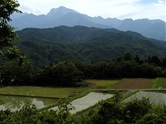 2001年6月1日 日野春駅→(自然観察歩道)→長坂駅 ![]() 甲斐駒ヶ岳を見たくなり、JR中央本線の日野春駅で下車。 上空には薄雲が広がっていたが、視程はまずまず。 釜無川の対岸に甲斐駒や鳳凰三山がそびえる。 ![]() 八ヶ岳もよく見えた。 手前の建物はオオムラサキセンター。この付近は国蝶のオオムラサキの生息地として有名。 ![]() 日野春駅から隣の長坂駅までは、約10kmの自然観察歩道が整備されている。 遠くからカッコウの鳴き声が聞こえてきた。 ![]() アザミの花とウラギンヒョウモン。 ![]() 田植えは既に終わり、田んぼはいっぱいに水をたたえていた。 |