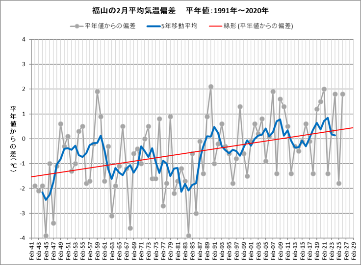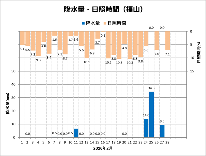 | ■2月の天候 福山は、平均気温7.0℃ (平年差 +1.8℃)、降水量65.5mm (平年比139%)、日照時間168.2h (同121%)でした。 気温は平年よりかなり高く、降水量は多く、日照時間も多い月でした。 24日から25日にかけての降水量は48.5mm。約4か月ぶりにまとまった雨が降ったと思ったら、2月としての24時間降水量の記録を更新しました。 ![]() ![]() |