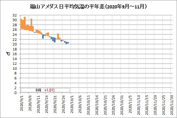 福山は、平均気温24.6℃ (平年差 +1.0℃)、降水量117.0mm (平年比89%)、日照時間156.6h (同94%)でした。