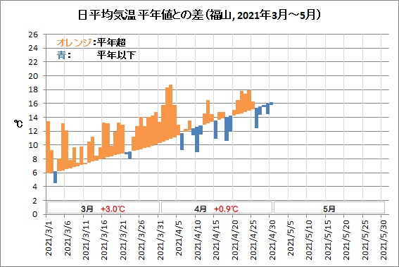 福山は、平均気温14.4℃ (平年差 +0.9℃)、降水量109.5mm (平年比117%)、日照時間222.0h (同115%)でした。