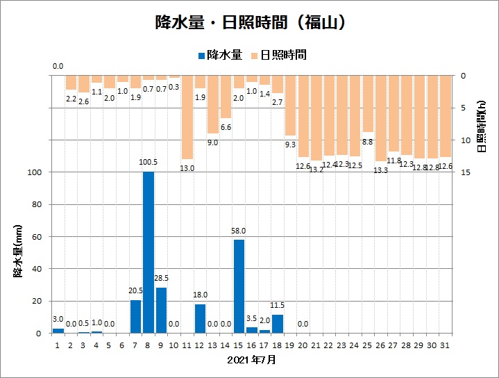 福山は、平均気温26.8℃ (平年差 +0.2℃)、降水量247.0mm (平年比125%)、日照時間206.8h (同107%)でした。