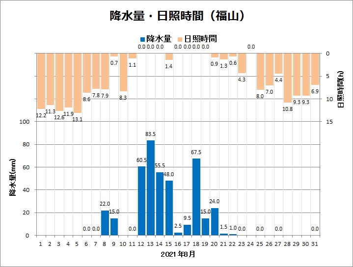 福山は、平均気温27.1℃ (平年差 -0.8℃)、降水量405.5mm (平年比426%)、日照時間159.7h (同72%)でした。