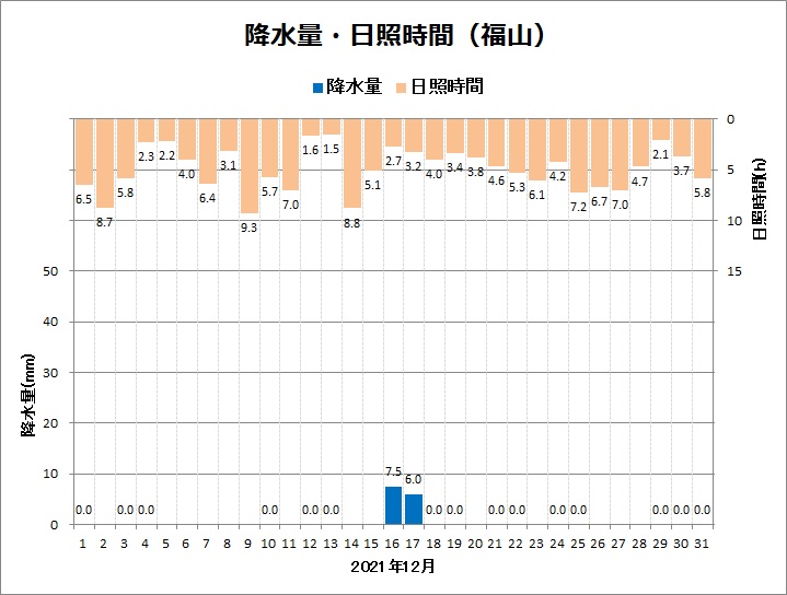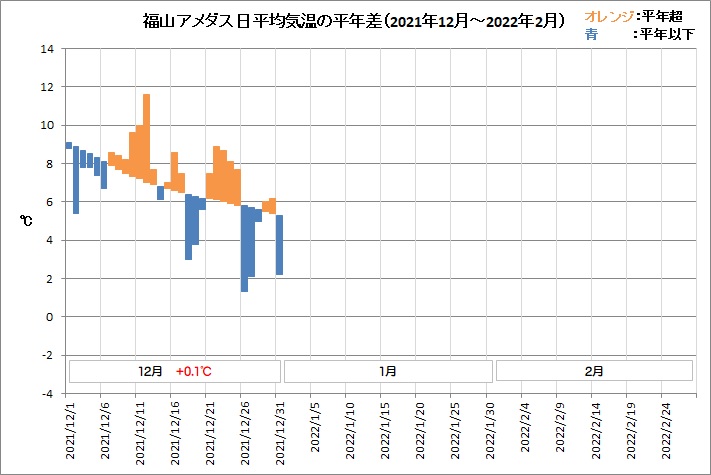 福山は、平均気温6.9℃ (平年差 +0.1℃)、降水量13.5mm (平年比31%)、日照時間152.5h (同105%)でした。