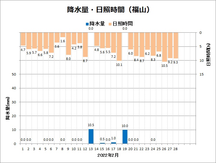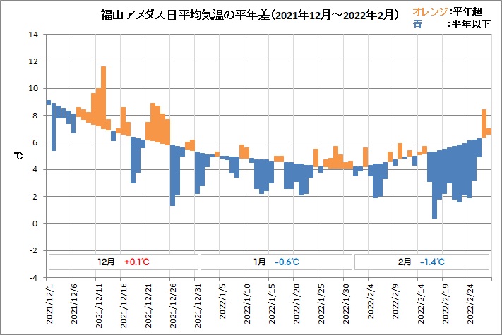 福山は、平均気温3.8℃ (平年差 -1.4℃)、降水量22.0mm (平年比47%)、日照時間172.4h (同124%)でした。