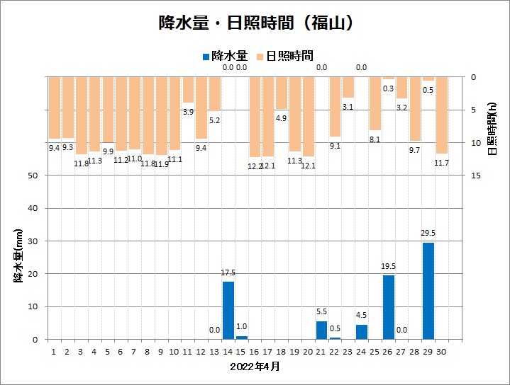 福山は、平均気温15.2℃ (平年差 +1.5℃)、降水量78.0mm (平年比85%)、日照時間225.5h (同118%)でした。