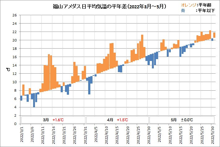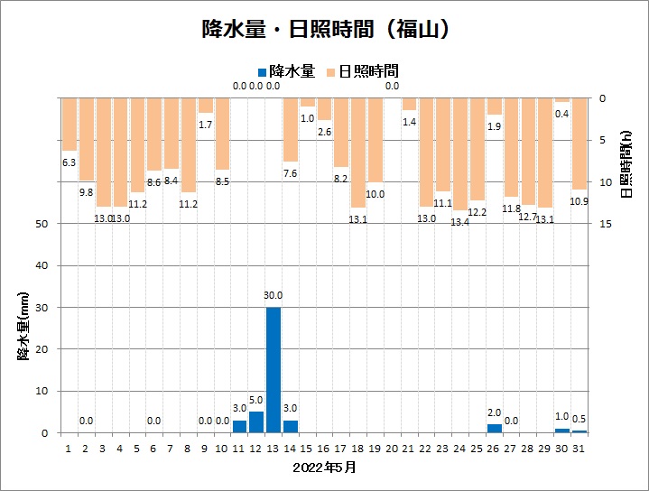 福山は、平均気温18.7℃ (平年差 ±0.0℃)、降水量44.5mm (平年比38%)、日照時間236.1h (同112%)でした。