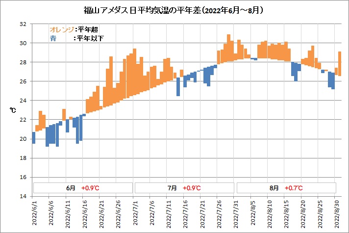 福山は、平均気温28.6℃ (平年差 +0.7℃)、降水量98.5mm (平年比103%)、日照時間217.9h (同98%)でした。