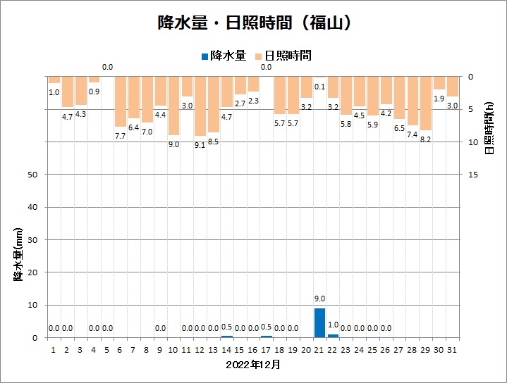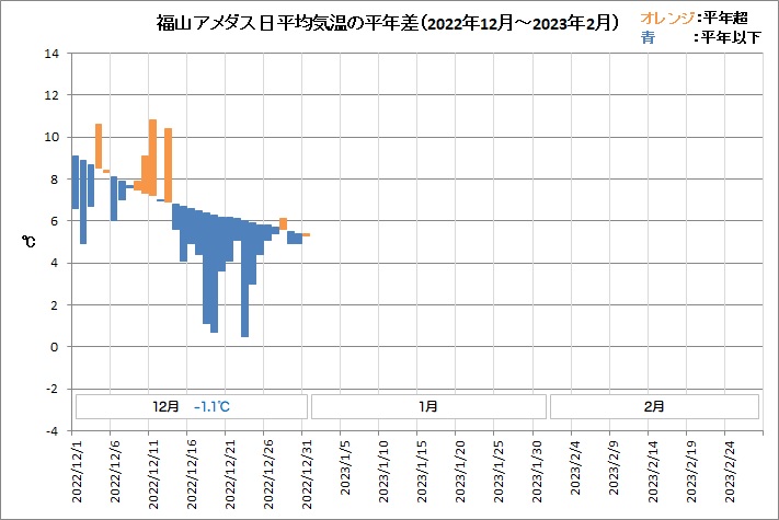 福山は、平均気温5.7℃ (平年差 -1.1℃)、降水量11.0mm (平年比25%)、日照時間141.0h (同97%)でした。