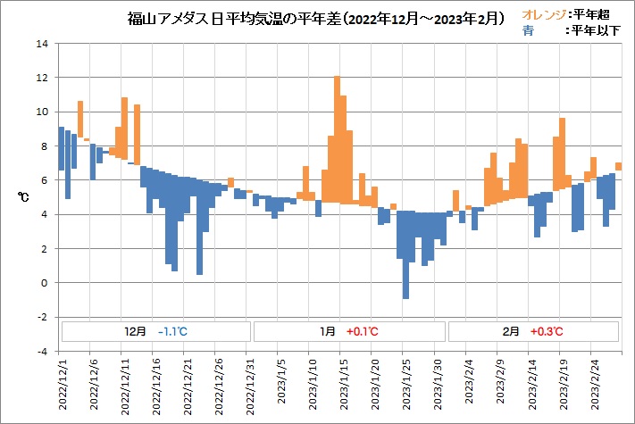 福山は、平均気温5.5℃ (平年差 +0.3℃)、降水量30.5mm (平年比65%)、日照時間140.4h (同101%)でした。