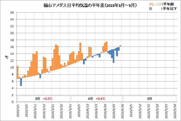 福山は、平均気温14.3℃ (平年差 +0.6℃)、降水量190.0mm (平年比207%)、日照時間196.4h (同103%)でした。