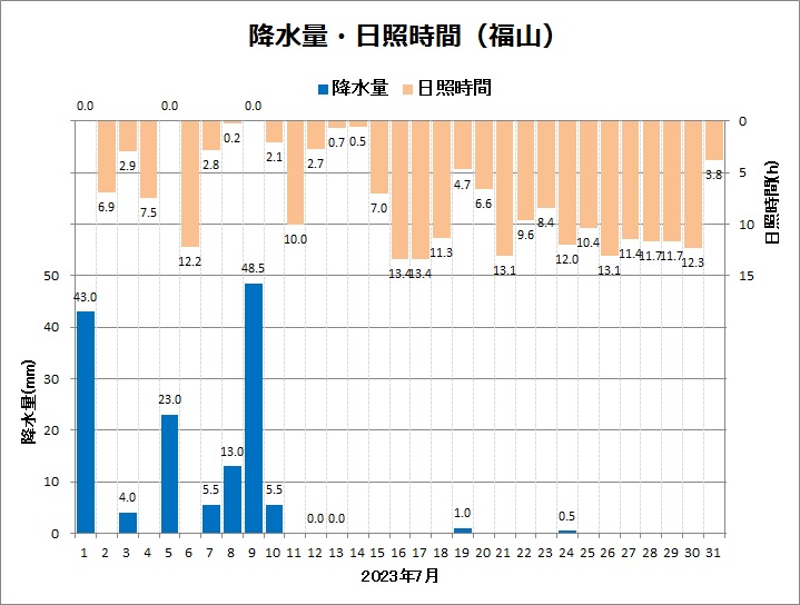 福山は、平均気温27.3℃ (平年差 +0.7℃)、降水量144.0mm (平年比73%)、日照時間222.4h (同115%)でした。