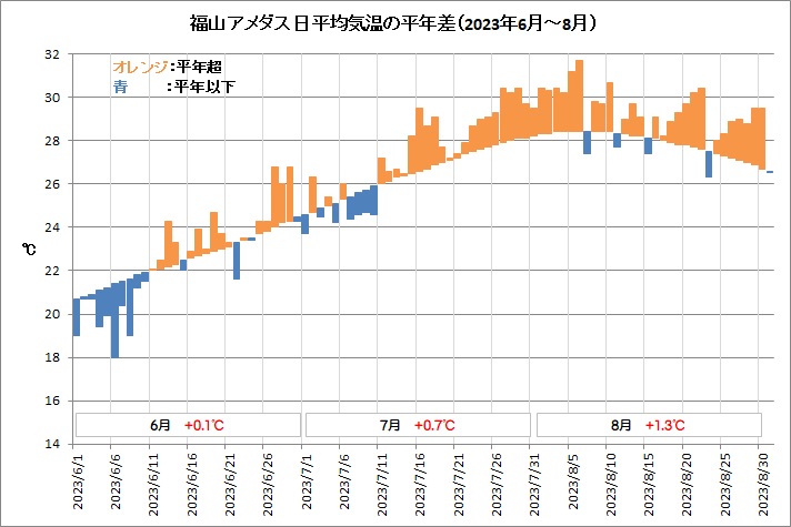 福山は、平均気温29.2℃ (平年差 +1.3℃)、降水量87.5mm (平年比92%)、日照時間213.0h (同96%)でした。