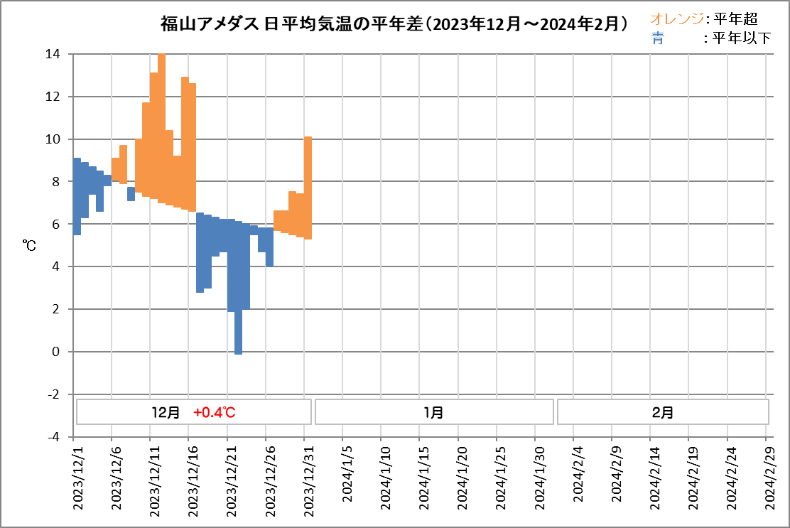 福山は、平均気温7.2℃ (平年差 +0.4℃)、降水量45.5mm (平年比105%)、日照時間153.5h (同105%)でした。
