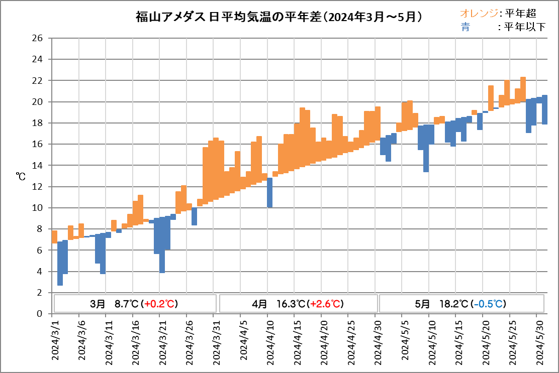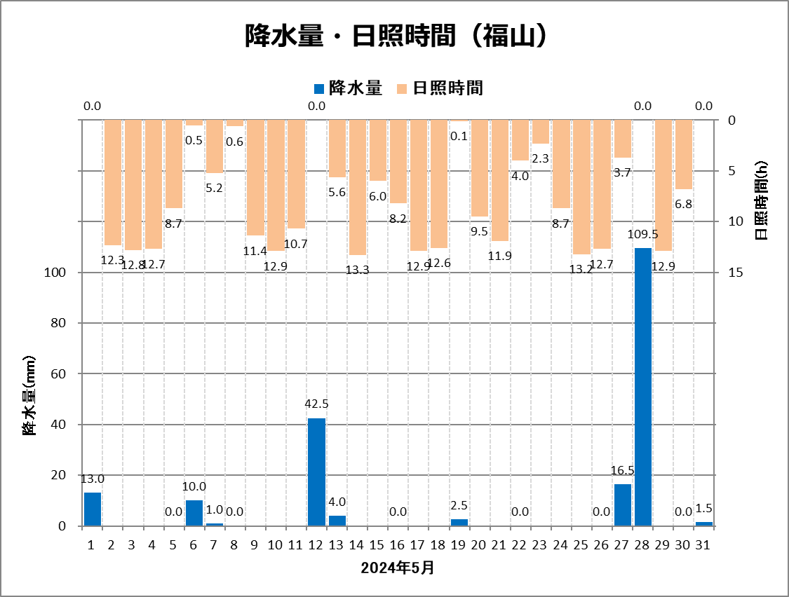 | ■5月の天候 福山は、平均気温18.2℃ (平年差 -0.5℃)、降水量200.5mm (平年比170%)、日照時間232.2h (同110%)でした。 月平均気温は低く、降水量はかなり多く、日照時間は多い月でした。 5月28日の日降水量109.5mmは、歴代2位の記録。 (注:1942年の観測開始以降、5月として) ![]() |