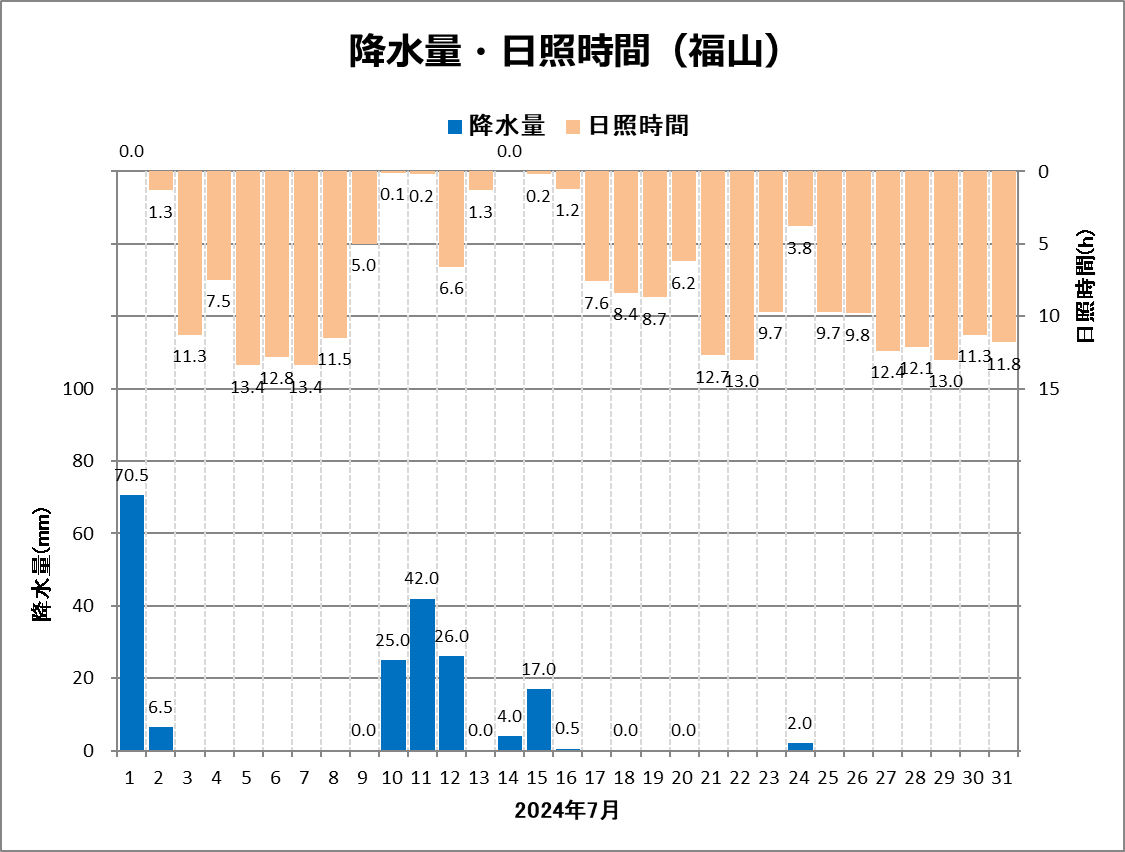 福山は、平均気温28.3℃ (平年差 +1.7℃)、降水量193.5mm (平年比98%)、日照時間236.0h (同122%)でした。