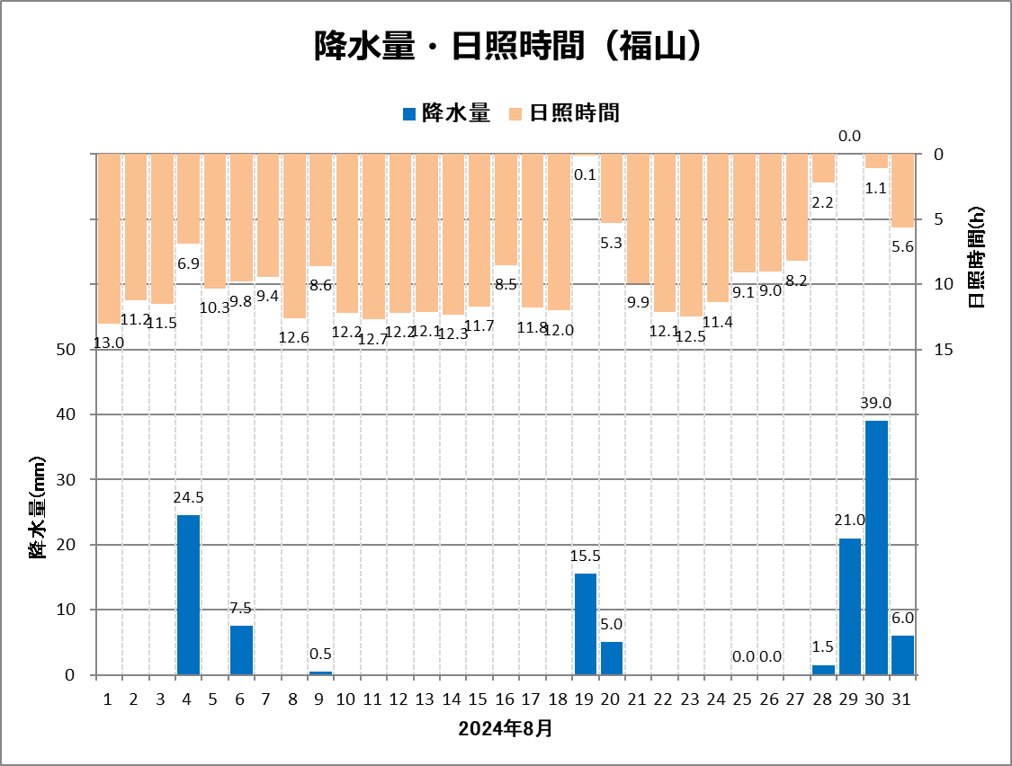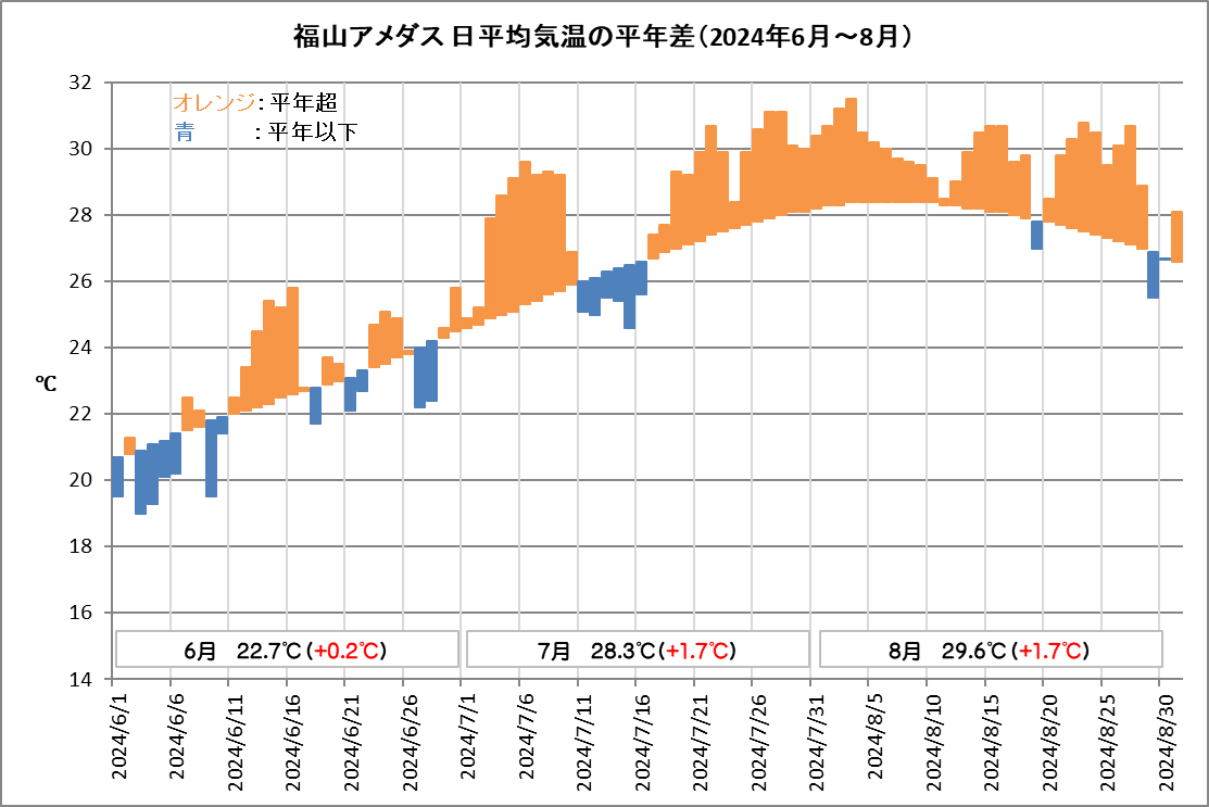 福山は、平均気温29.6℃ (平年差 +1.7℃)、降水量120.5mm (平年比127%)、日照時間285.3h (同129%)でした。