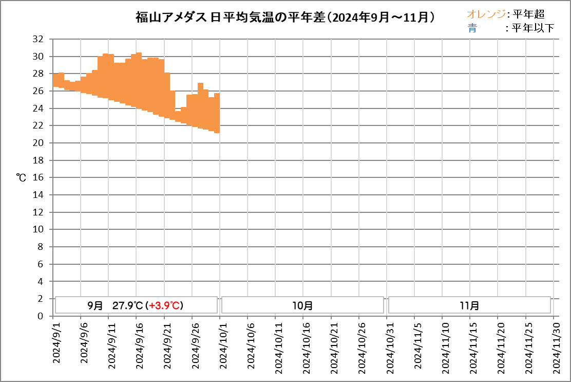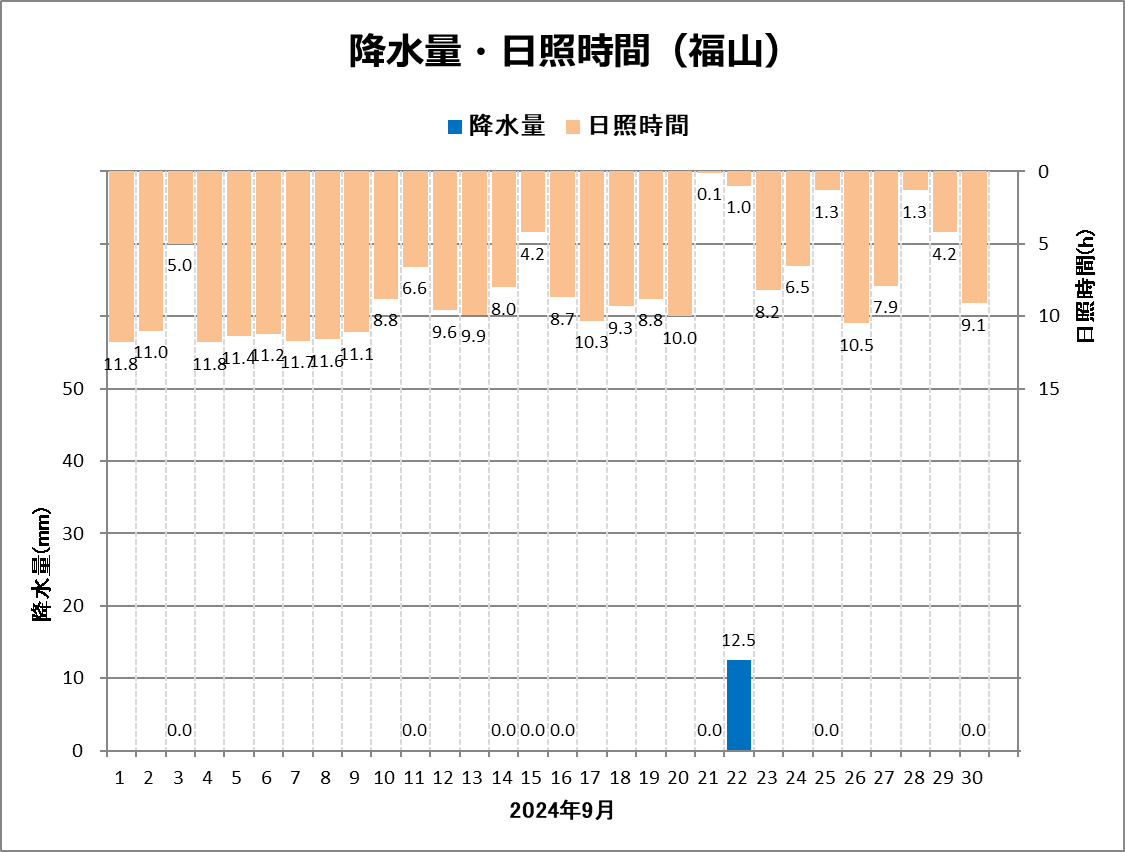 | ■9月の天候 福山は、平均気温27.9℃ (平年差 +3.9℃)、降水量12.5mm (平年比9%)、日照時間240.9h (同145%)でした。 月平均気温は平年より著しく高く、降水量は極端に少なく、日照時間はかなり多い月でした。 9月の月平均気温は昨年(2023年)に最高値を更新したばかりでしたが、今年はそれをも大幅に上回る結果になりました。 ![]() |