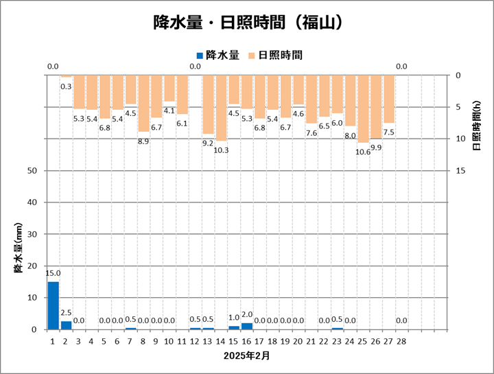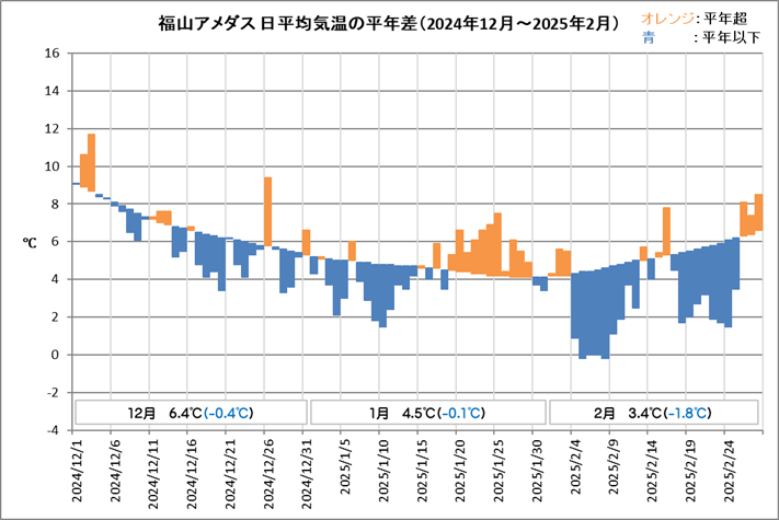 | ■2月の天候 福山は、平均気温3.4℃ (平年差 -1.8℃)、降水量22.5mm (平年比48%)、日照時間162.4h (同117%)でした。 月平均気温は平年よりかなり低く、降水量は少なく、日照時間は多い月でした。 ![]() |