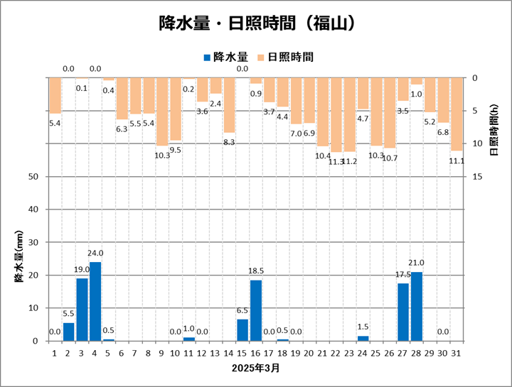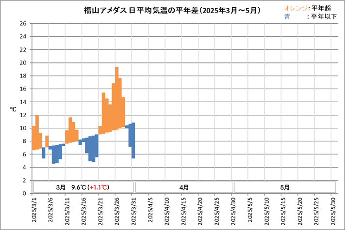 福山は、平均気温9.6℃ (平年差 +1.1℃)、降水量115.5mm (平年比138%)、日照時間166.5h (同95%)でした。