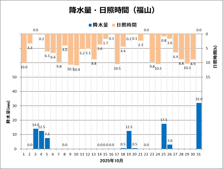 福山は、平均気温20.1℃ (平年差 +2.1℃)、降水量100.0mm (平年比110%)、日照時間160.7h (同92%)でした。